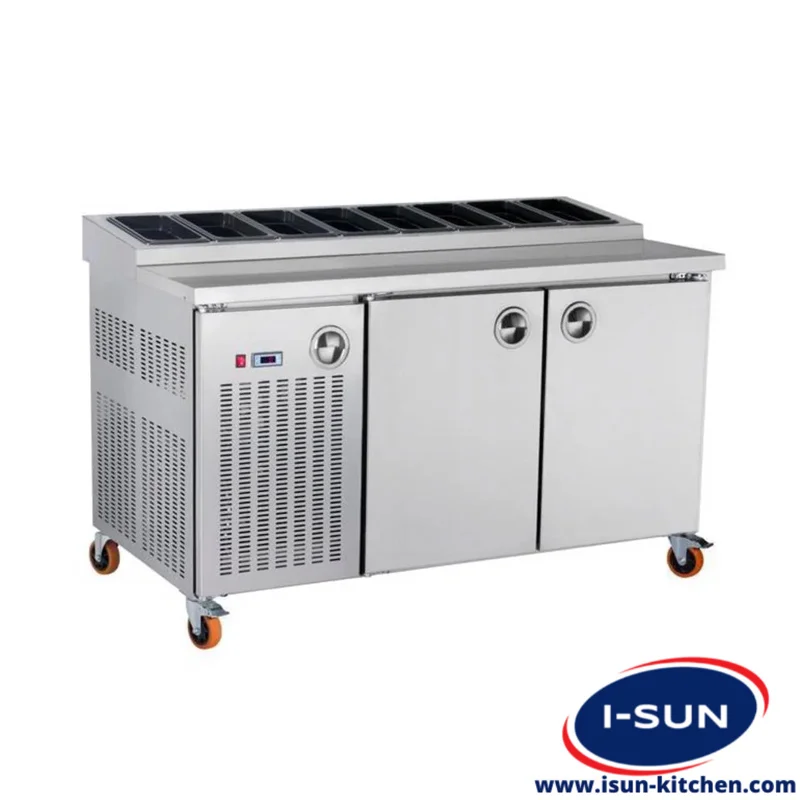 تاپینگ فریزر استیل آیسان دارای میز کار + یخچال صنعتی خوابیده + ظروف مواد پیتزا و ساندویچ می باشد که باید فشار سرما به ظرف ها هم برای حفظ و نگهداری مواد اولیه رسانده شود.