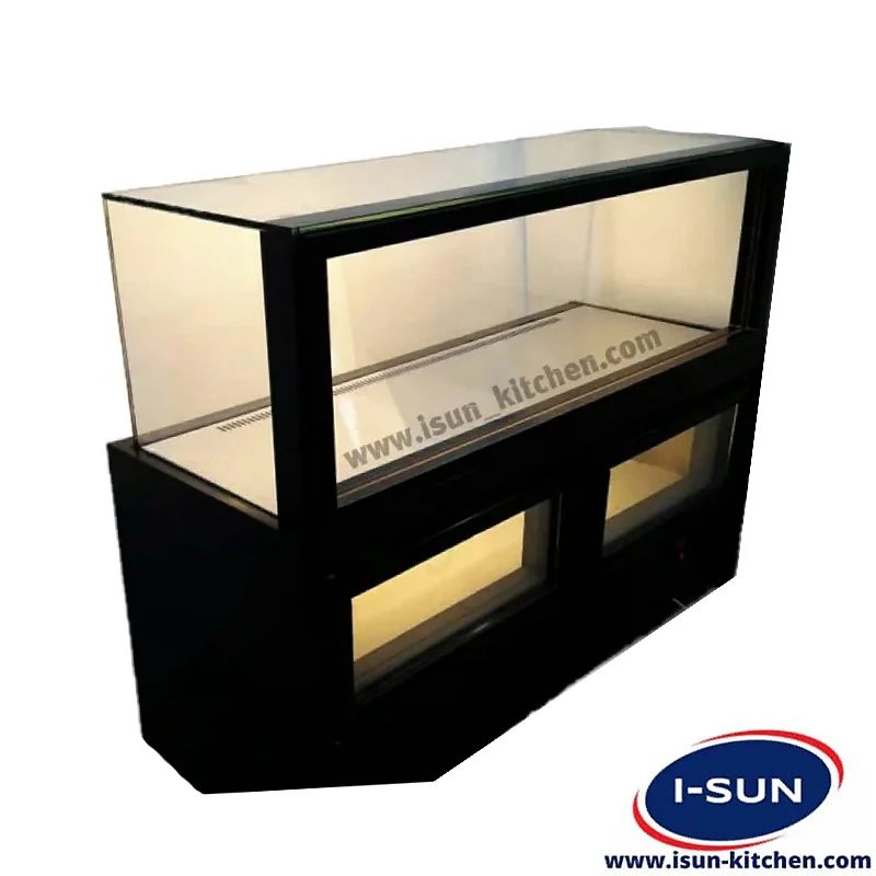شرکت آیسان با توجه به سابقه و تجربه در ساخت تجهیزات برودتی توانسته طرحی متفاوت و خاص از این محصول را به بازار ارائه دهد.دستگاه شو کیک فرانسوی در مدل ایستاده ارائه شده است که دارای کیفیت بسیار بالا و ظاهری زیبا می باشد. قسمت بالای دستگاه به صورت تمام شیشه ای و قسمت پایین دستگاه به صورتی ساخته شده که هم می توان به صورت مستقیم در دید مشتری قرار بگیرد و هم به صورت توکار استفاده شود. در قسمت پایین دستگاه نیز یک یخچال جهت نگهداری انواع مواد غذایی تعبیه شده است.
