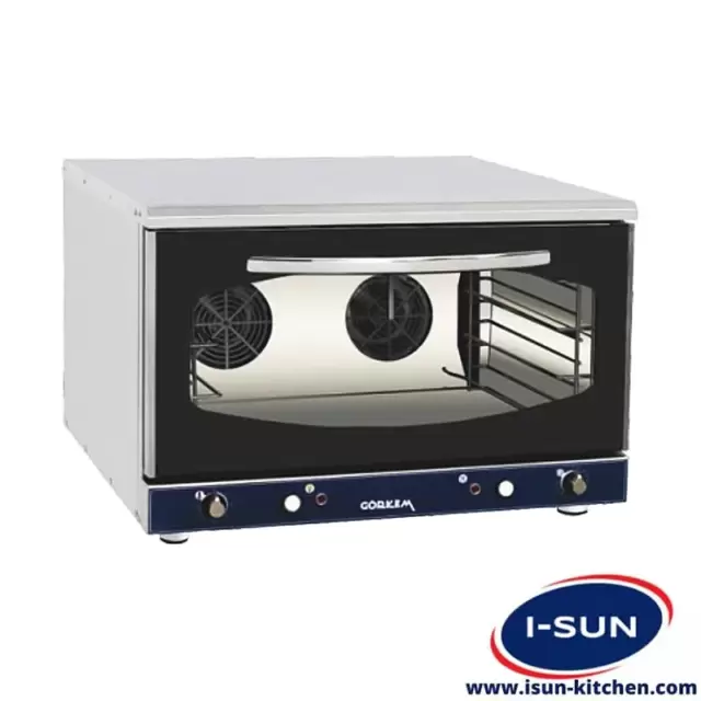 فر گورکم یک فر کانوکشن مرطوب ساخت ترکیه می باشد. این دستگاه دارای ظرفیت 4 سینی 40*60 می باشد. و دارای دو عدد فن جهت چرخش یکنواخت هوا در فضای فر می باشد. فر گورکم با قابلیت وصل شدن به آب شهری و ایجاد بخار می تواند انواع مواد غذایی مانند انواع نان های فانتزی، پیتزا، سبزیجات، مرغ، گوشت و… را پخت کند. البته ذکر این نکته مهم است که این دستگاه نمی تواند چند نوع محصول را به صورت همزمان پخت کند مگر اینکه محصولات مورد نظر از لحاظ تداخل بو مشکلی نداشته باشند و از نظر زمان پخت با هم یکسان باشند. چون تنظیمات پخت در این دستگاه کلی می باشد و عمل پخت روی هر 4 سینی یکجا انجام می شود ( یعنی برای هر سینی به صورت جداگانه امکان تنظیم وجود ندارد). در ارتباط با تفاوت عمده ی این دستگاه با دستگاه های کامبی نیز باید گفت که در دستگاه های کامبی امکان تنظیم دما و درجه رطوبت به صورت مجزا وجود دارد اما در دستگاه های کانوکشن این امکان وجود ندارد و افزایش رطوبت بر اساس افزایش دما به صورت پله ای خواهد بود. البته امکان خاموش کردن رطوبت یا فن در این دستگاه وجود دارد و می توان پخت بدون فن و رطوبت را انجام داد. دستگاه از جنس تمام استیل می باشد و در قسمت داخلی که با رطوبت در ارتباط است کاملا از جنس ضدزنگ می باشد. این دستگاه از نظر عایق های حرارتی کاملا مورد اطمینان است و با استفاده از برق تک فاز کار می کند. برای کار در منزل و کافه های کوچک بسیار مناسب می باشد.