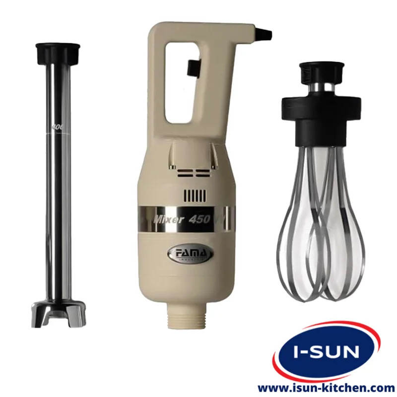 دستگاه میکسر برقی فاما مدل FM 450VV برای خمیر گرفتن، مخلوط کردن و خرد کردن مورد استفاده قرار میگیرد و در واقع برای این مصارف ساخته شده است. بخشی از قیمت دستگاه میکسر برقی فاما صرف تعبیه کردن سیستمی به نام SRS (self-regulating-speed) به معنی تنظیم کننده خودکار سرعت، در برد الکترونیکی آن شده است تا سرعت دستگاه متناسب با قدرت لحظهای آن پایدار شود؛ قابلیتی که در بهبود عملکرد دستگاه بسیار موثر است. میکسر برقی فاما دوعدد سری همزن و گوشتکوب در طولهای مختلف دارد که از استیل ضدزنگ ساخته شدهاند و به راحتی شسته میشوند؛ طول آنها به ترتیب 33 و 50 سانتیمتر است. عرض این دستگاه مخلوط کن دستی 13 سانتیمتر بوده و ارتفاع آن 38 سانتیمتر میباشد، البته بدون در نظر گرفتن تیغه همزن. وزن خالص همزن برقی ایتالیایی نیز 3 کیلو و 20 گرم است. برای تغذیه این نوع مخلوط کن دستی برقی باید از ولتاژ تکفاز 230 ولت استفاده کرد که فرکانس آن 50-60 هرتز میباشد. درمجموع با توجه به قابلیتها و شاخصههای ذکر شده، خرید دستگاه میکسر برقی فاما جهت استفاده در بستنیفروشیها، هتلها، غذاخوریها یا رستورانها و شیرینیفروشیها بهترین انتخاب است.