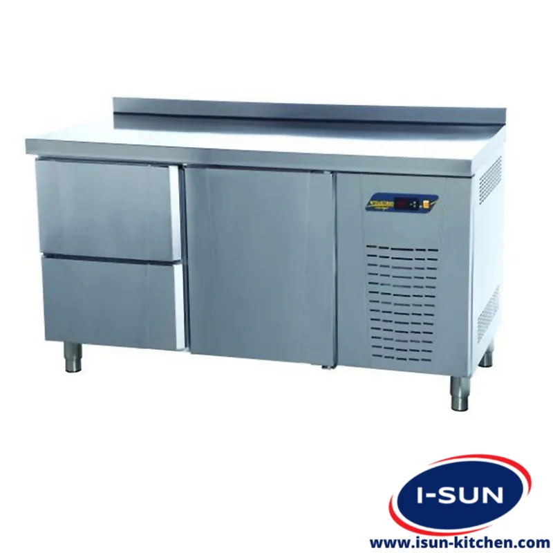 یخچال میز کار 150 سانتی 2 کشو و یک درب انداستریو N’DUSTRIO تمام سطوح از جنس استنلس استیل از جمله قسمت پشتی ، داخلی ، خارجی و بدنه ساخته شده است و صفحه ی بالایی آن لبه دار می باشد. گنجایش داخلی این یخچال زیاد است و درب های کشویی با المنت های حرارتی ضد چکه می باشد. درب ها به گونه ای طراحی شده است که از حدر رفتن انرژی جلوگیری می کند.